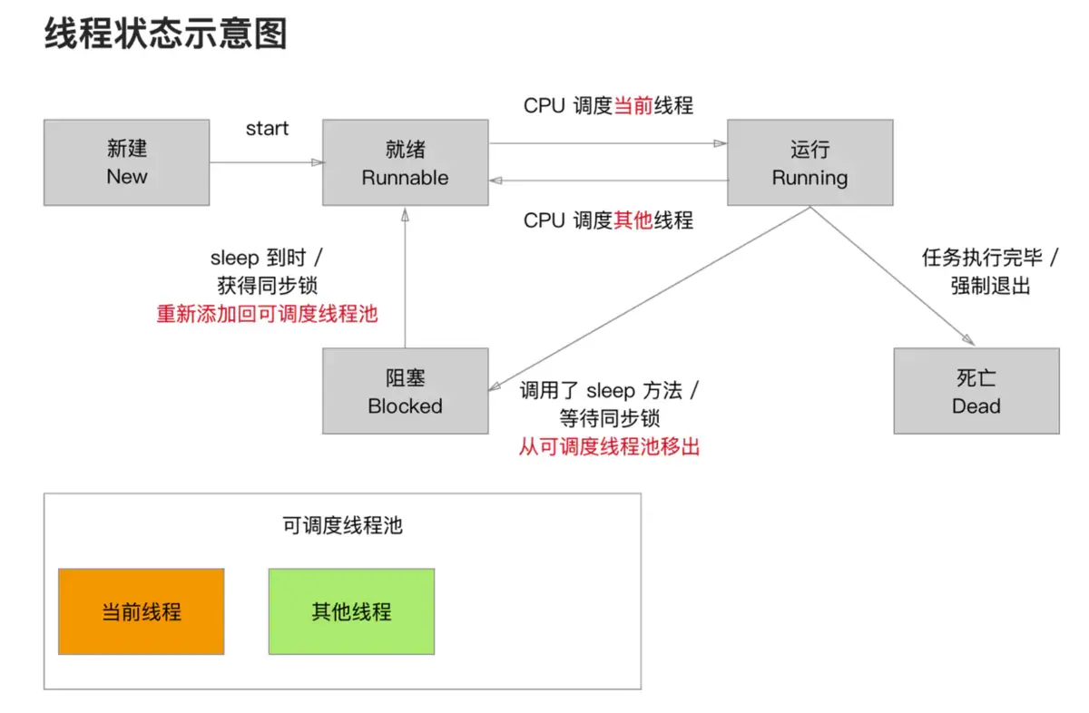 - 就绪:向线程对象发送start消息,线程对象被加入可调度线程池等待CPU调度