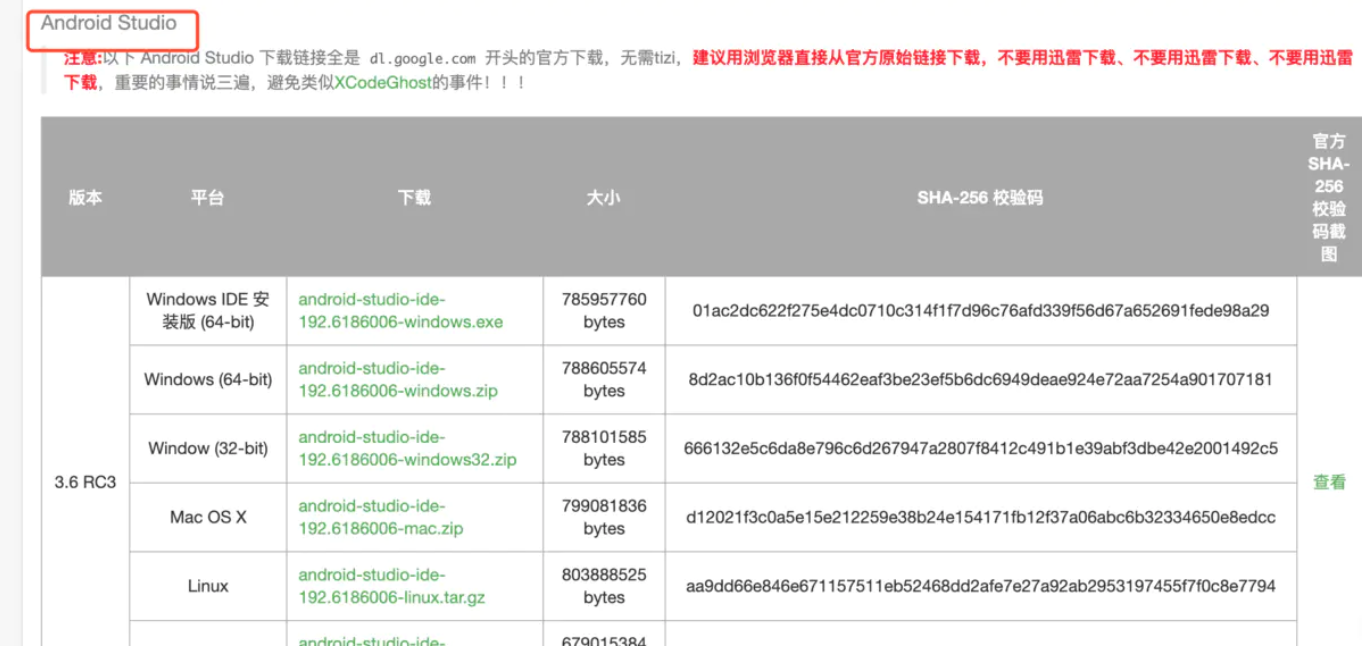 前往下面网站,滑倒‘Android Studio’栏,选择对应版本进行下载 www.androiddevtools.cn/