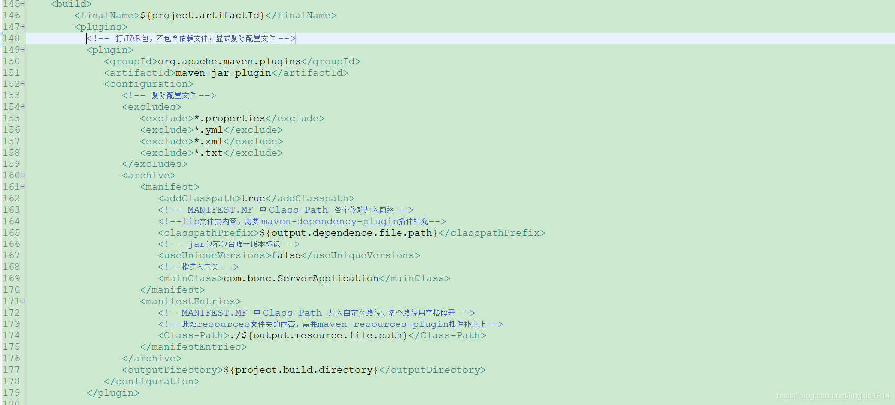<!-- 打JAR包,不包含依赖文件;显式剔除配置文件 -->