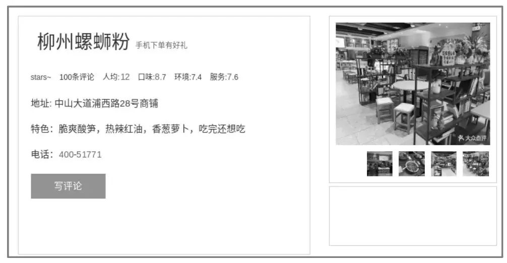 任务:爬取美食商家评价网站页面中的商家联系电话、店铺地址和评分数据,页面内容如图 6-15 所示。