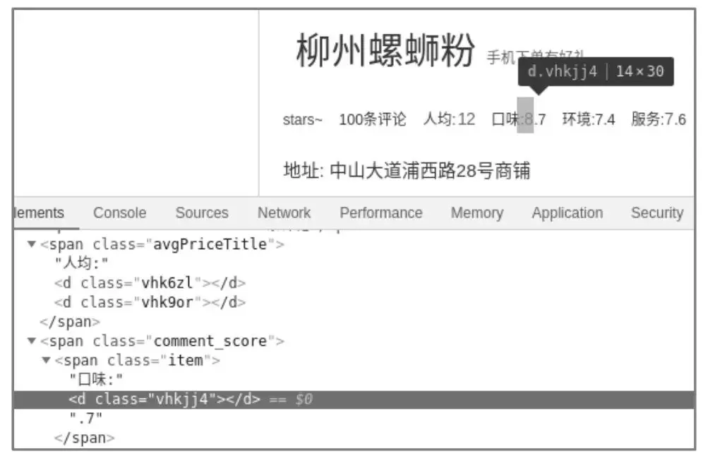除了刚才的数字映射之外,大众点评还对中文进行了映射。此时如果按照示例 6 中人为地将 class 值和对应的文字进行映射的话,就非常麻烦了。试想一下,如果网页中所有的文字都使用这种映射反爬虫的手段,那么爬虫工程师要如何应对呢?对所有用到的文字进行映射吗?