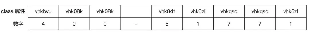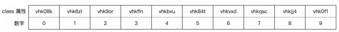 从图 6-17 中可以看出,class 属性值和数字是一一对应的,如属性值 vhk08k 与数字 0 对应。根据这个线索,我们可以猜测每个数字都与一个属性值对应,对应关系如图 6-18 所示。