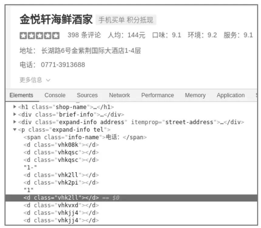 HTML 代码中有数字 7 和小数点,但没有 8 这个数字,似乎数字 8 的位置被 d 标签占据。而商家电话号码处的显示就更奇怪了,一个数字都没有。商家电话对应的 HTML 代码如下: