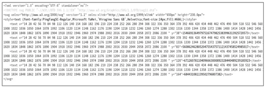 源代码中前两行表明这是一个 SVG 文件,该文件中使用 text 标签定义文本, style 标签用于设置文本样式, text 标签定义的文本正是图片页面显示的数字。难道这些无序的数字就是我们在页面中看到的电话号码和评分数字?