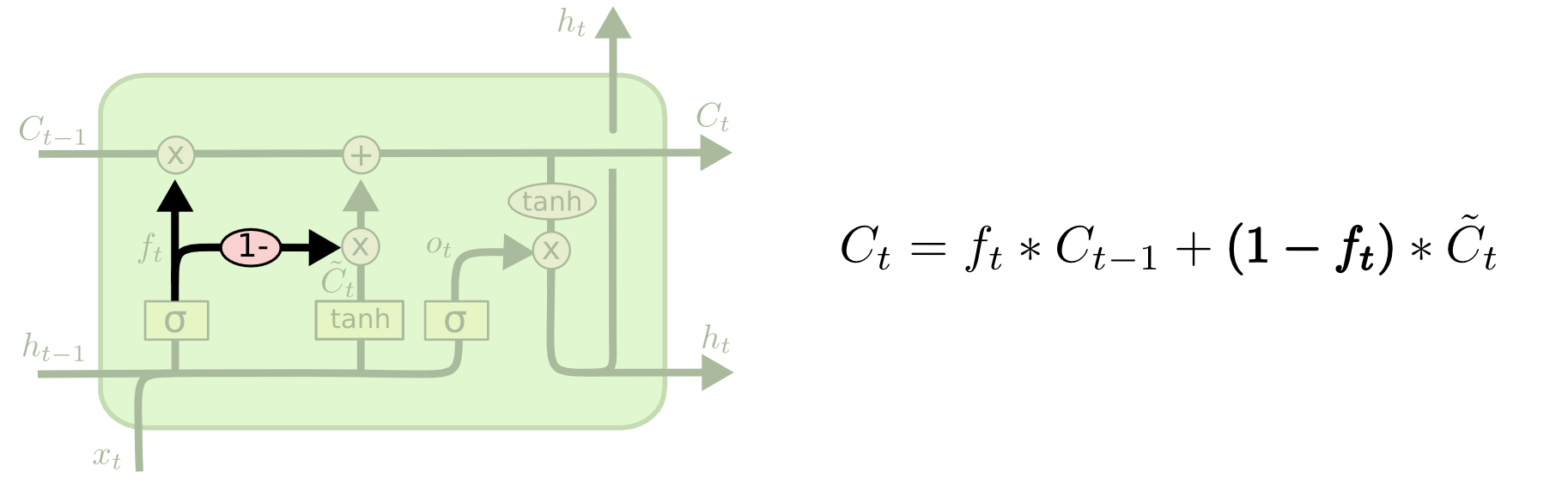 还有一种变式是在忘记门与输入门之间引入一个耦合。不同于之前的LSTM结构,忘记门和输入门是独立的,这个变式是在忘记门删除历史信息的位置加入新的信息,在加入新信息的位置删除旧信息。该结构如下图所示。