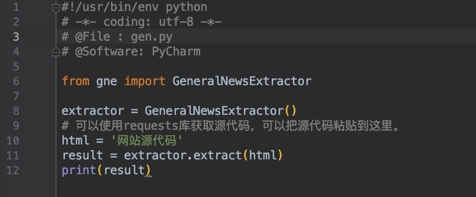 GeneralNewsExtractor(GNE)是一个通用新闻网站正文抽取模块,会输入一篇新闻网页的 HTML, 输出正文内容、标题、作者、发布时间、正文中的图片地址和正文所在的标签源代码。GNE在提取今日头条、新浪,腾讯新闻等数百个中文新闻网站上效果非常出色,几乎能够达到100%的准确率。