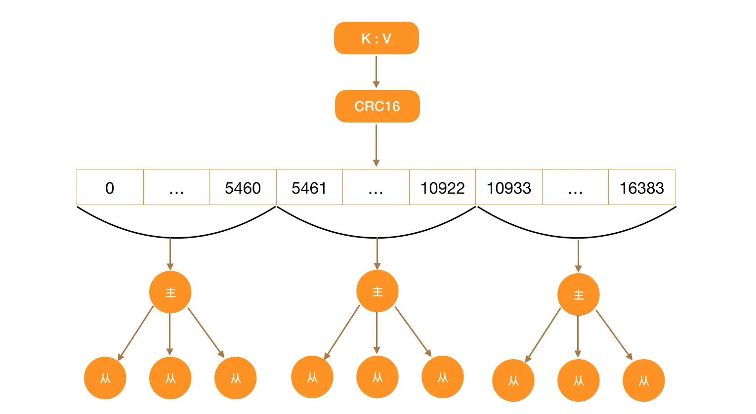 每个主节点会管理其中一部分 slot,至于 key 会被分配到哪个区域是靠 CRC16 这个算法来实现的。