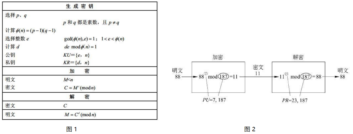 前两个要求很容易得到满足。当 e 和 n 取很大的值时,第三个要求也能够得到满足。下面的图 1 总结了 RSA 算法。