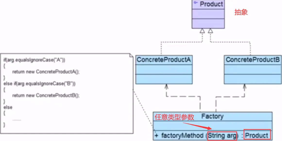 - 客户端只知道传入工厂类的参数,对于如何创建对象不关心:客户端既不需要关心创建细节,甚至连类名都不需要记住,只需要知道类型所对应的参数。