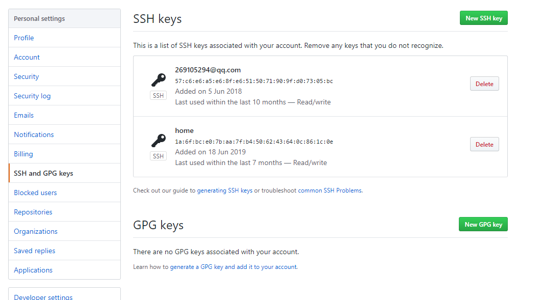 - 1.打开GitHub,点击Settings,点击左侧SSH and GPG keys