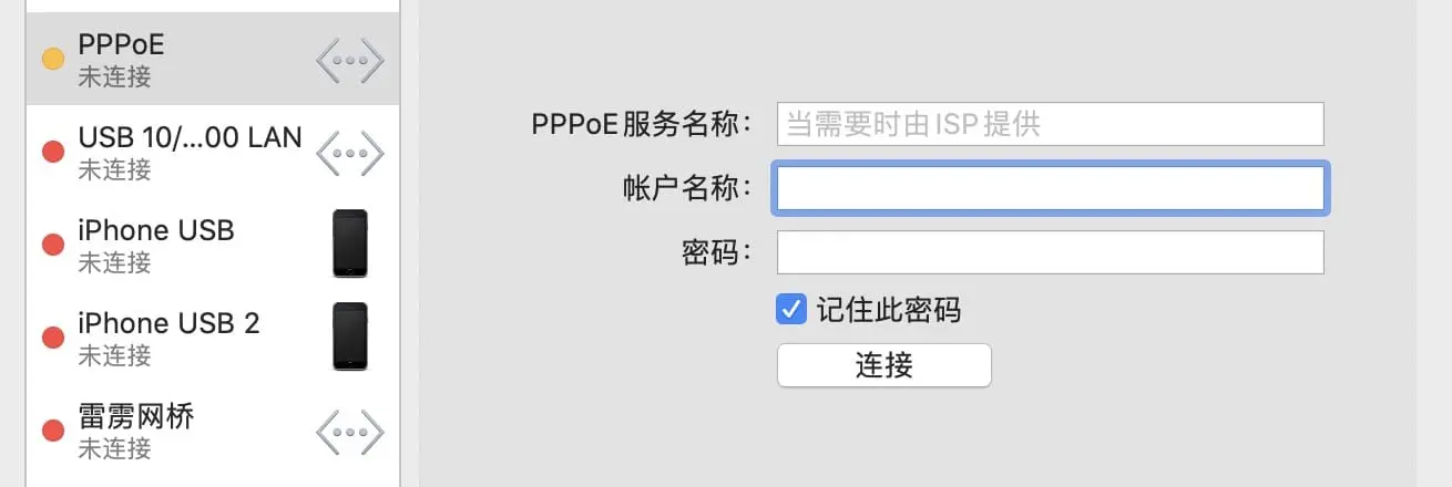 在 macOS 的体现: PPPoE(英语:Point-to-Point Protocol over Ethernet),以太网上的点对点协议。