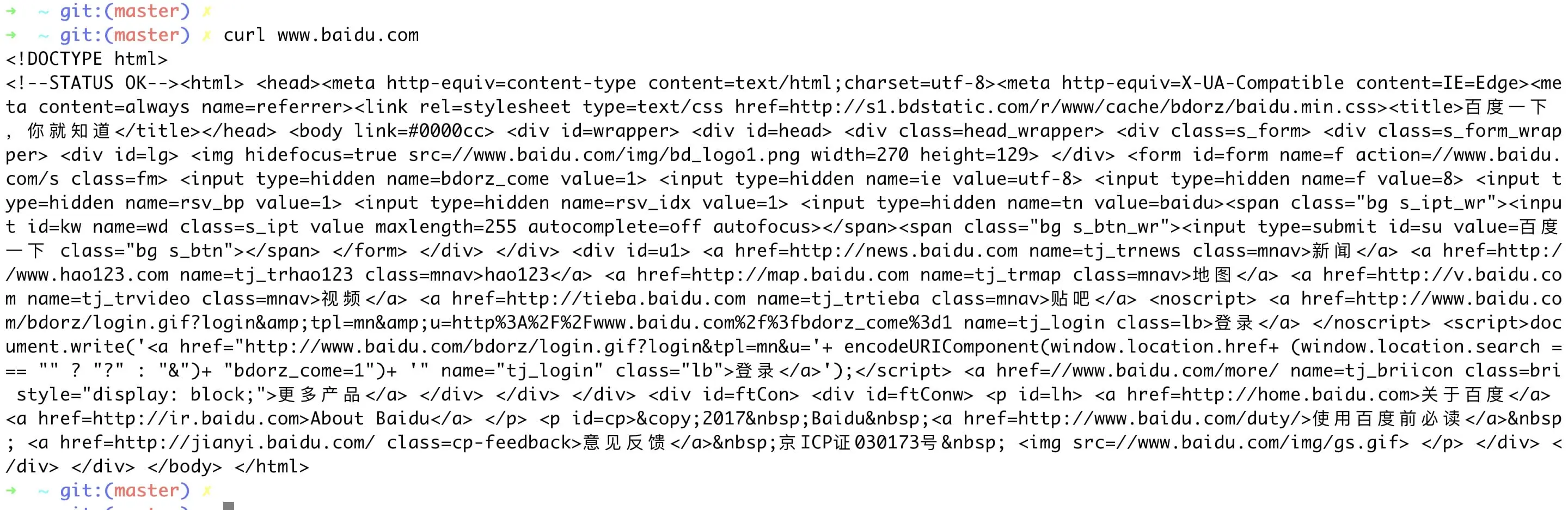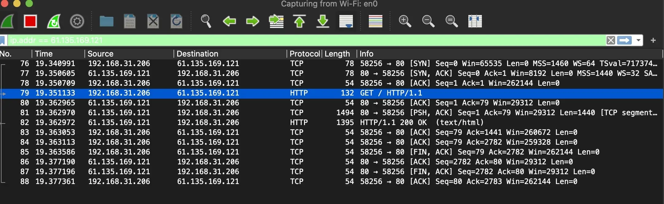 关于如何使用 Wireshark,请看 使用 wireshark 学习网络协议。通过 ping www.baidu.com 得到百度的 IP 地址为 61.135.169.121,在 Wireshark 中配置过滤条件后,通过使用命令 curl www.baidu.com 来模拟打开百度首页:
