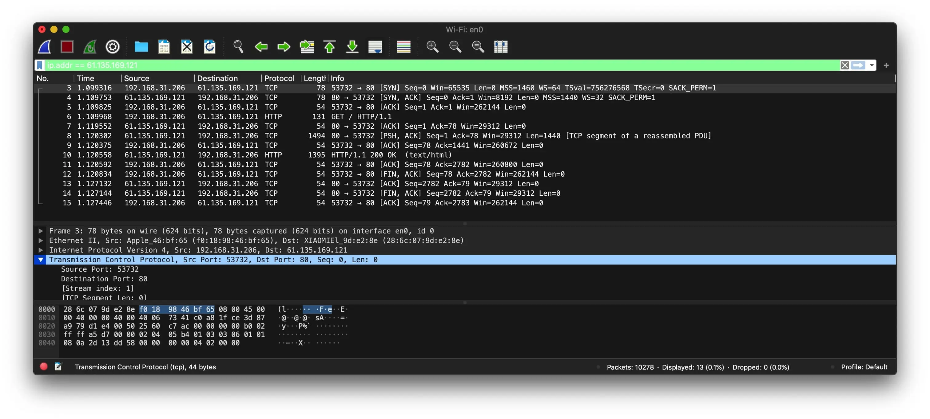 此时在 Wireshark 中可以看出,TCP 协议发送了以太帧,以太帧的格式是:Ethernet II 标头 + IP 4 标头 + TCP 标头 + TCP 数据,TCP 标头显示源端口为 53732,目的地端口为 80;IP 标头显示源 IP 地址为 192.168.31.206,目的地 IP 地址为 61.135.169.121;以太网标头显示源 MAC 地址为 f0:18:98:46:bf:65,目的地 MAC 地址为 28:6c:07:9d:e2:8e(小米路由器地址)。帧的长度为 78 字节,TCP 数据包的长度为 44 个字节。