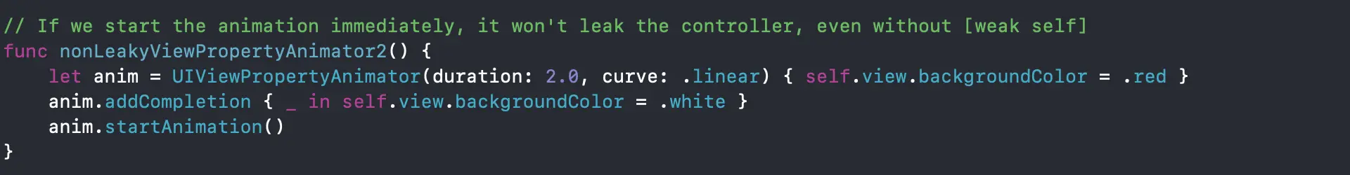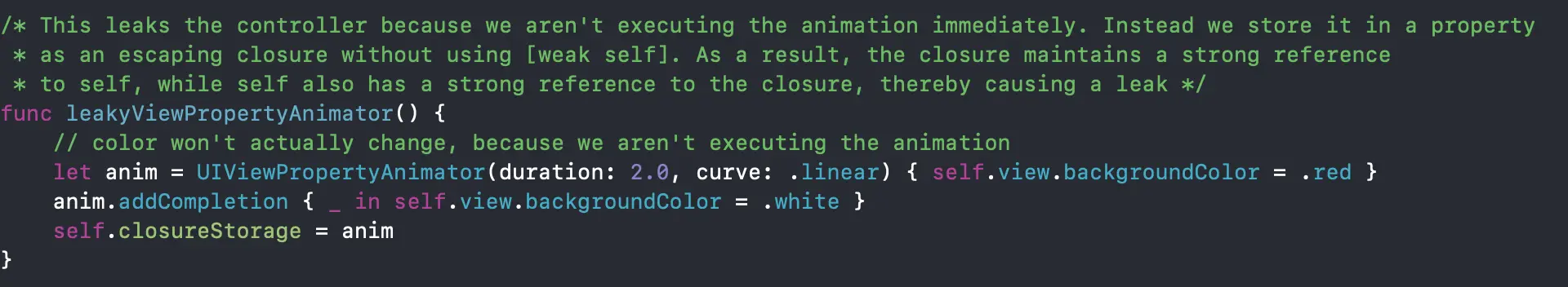 这种问题不会带来内存泄漏,但如果viewcontroller在dismiss后,在一段不可预估的时间内不能被置为nil,往往会带来不可预估的问题,这种情况下,我们需要使用[weak self]。另一方面,如果你要确保闭包里的这段代码必须完整的执行,即使ViewController被dismiss,那么我们可以不使用[weak self]。