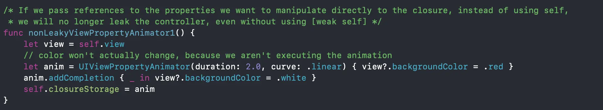 我们可以将闭包中操作的对象参数当作一个引用传递给闭包,这样也可以在不使用[weak self]的情况下避免内存泄漏
