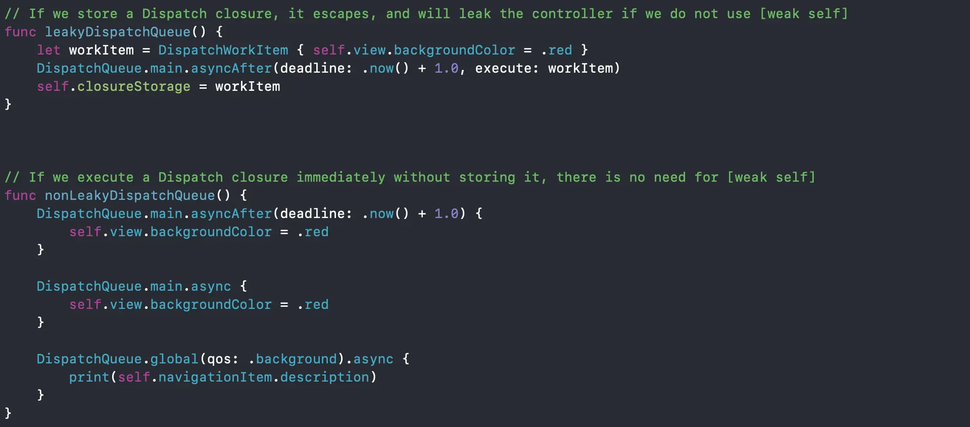 当我们在闭包中使用GCD的时候,一般也不需要使用[weak self],除非我们把闭包赋值给存储变量并且没有立即执行该闭包。
