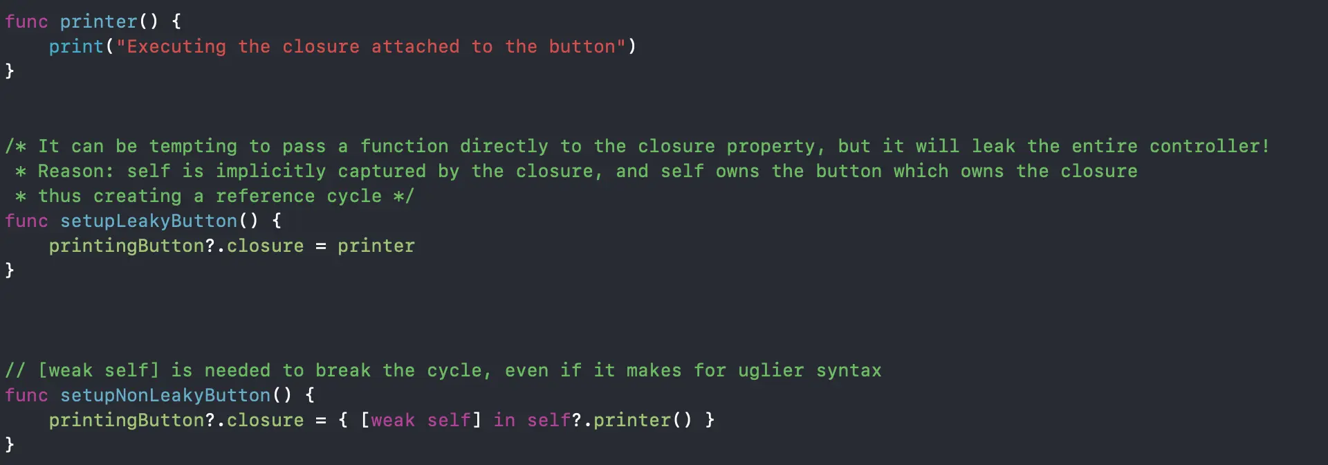 其中self持有printingButton,closure又持有self。