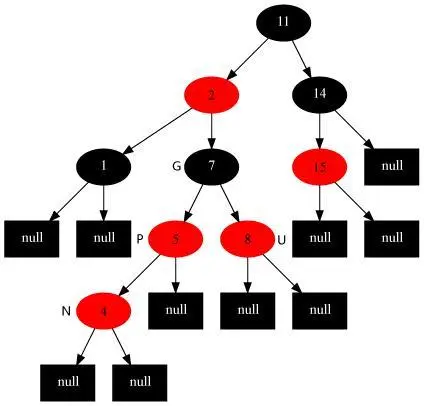 插入修复情况1:如果当前结点的父结点是红色且祖父结点的另一个子结点(叔叔结点)是红色