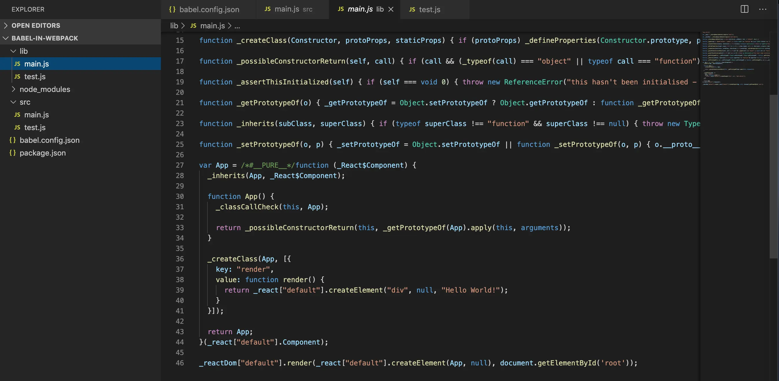 我们来看 Babel 编译结果 lib/main.js 和 webpack 编译结果 dist/main.js,发现 Babel 仅仅是将 src/main.js 的react语法编译成了js语法,而 webpack 将 src/main.js 和引入的 node_modules 融合后用 Babel 编译。