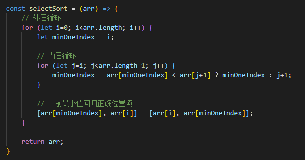 原理:通过两层循环来实现,外层遍历整个数组,内层再遍历一次数组并找到未排序数组中的最小数组(通过迭代比较,不停去相对最小值),然后将最小值与第一个数组项对调,接着外循环进入第二轮,便从第二项数组开始重复上述操作,直到整个数组排列完毕;