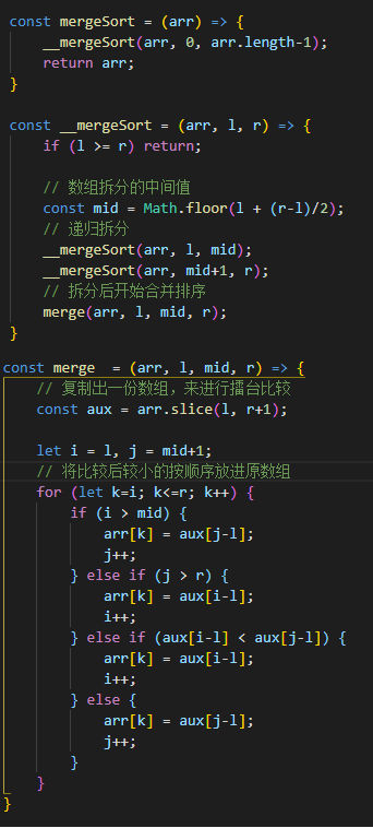 那么这个归并后的排序怎么进行呢?我们知道,归并前有两个相邻数组,他们之间之前没有联系过,那怎么保证他们归并后是排好序的呢?首先将这两个要合并的数组成为arr1,然后再将这两个组数组复制一份成为arr2(再将arr1的两个数组合并),然后将arr2中两个数组从头开始依次以擂台的形式互比,谁小谁就先被赋值回arr1较前的位置,arr1从头往后按顺序赋值下去,直到排号序。最后通过这样递归的方式将整个数组排好序。我这里用了很多次“合并数组”这个词,但实际代码里为了性能更好,一般不会这样频繁操作数组,而是将数组的序号抽象出来,达到分开和归并的效果,具体代码看下图;