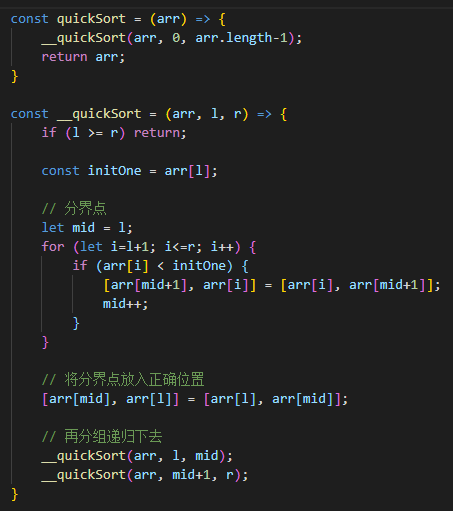 原理:快速排序也是运用了分组递归的思想,首先找到这个分组的分界点(一般为当前数组首位),然后将这个分界点在数组中进行循环比较,最后让它回到它正确的位置,以此分界,分为两个数组递归下去,在这样的过程中逐渐完成排序。代码如下图。