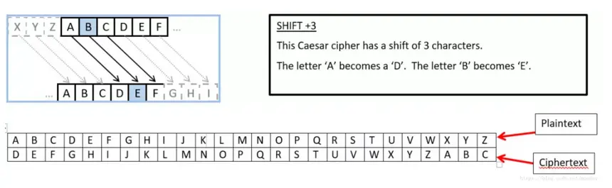 - 明文中的所有字母从字母表向后(或向前)按照一个固定步长进行偏移后被替换成密文。