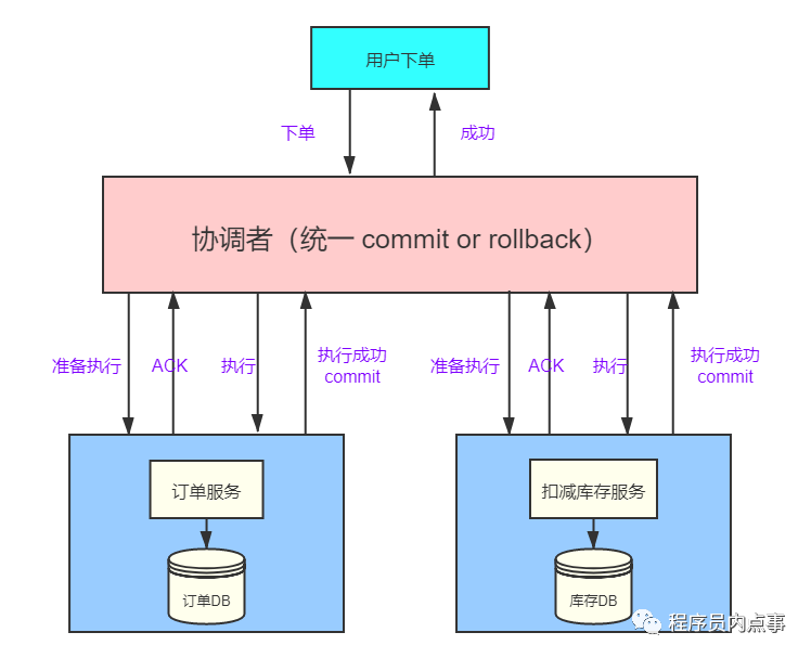 下面还拿下单扣库存举例子,简单描述一下两段提交(2PC)的原理: