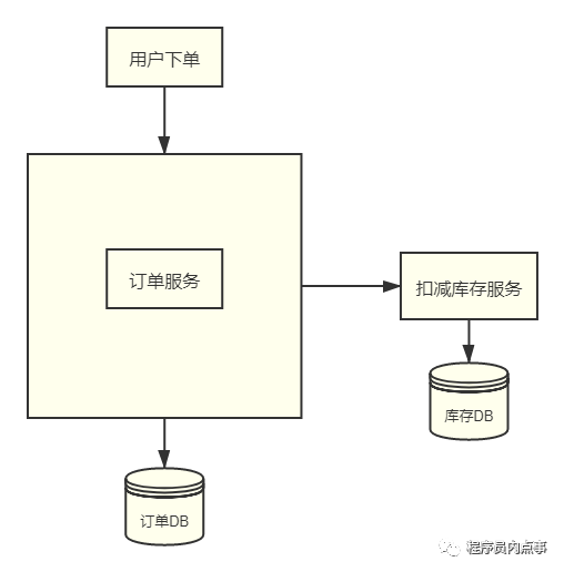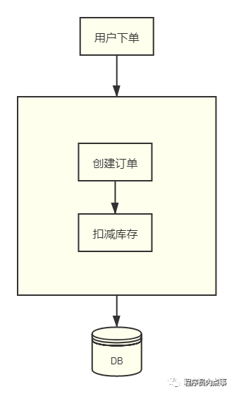 额~ 看了反而更懵逼了,简单的画个图好让大家理解一下,拿下单减库存来说举例:当系统的业务量很小时,“ 一站式”的系统完全可以满足现有业务需求,所有的业务都共用一个数据库,整个下单流程或许只用在一个方法里同一个事务下操作数据库即可。