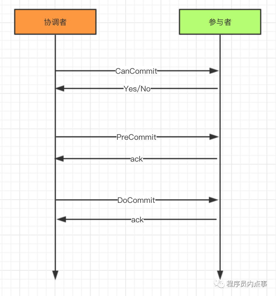 PreCommit:协调者 向所有参与者 发送PreCommit 命令,询问是否可以进行事务的预提交操作,参与者接收到PreCommit请求后,如参与者成功的执行了事务操作,则返回Yes 响应,进入最终commit阶段。一旦参与者中有向协调者发送了No 响应,或因网络造成超时,协调者没有接到参与者的响应,协调者向所有参与者发送abort 请求,参与者接受abort命令执行事务的中断。