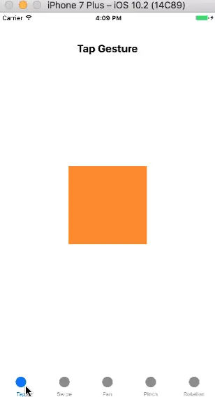 在上面的代码中,如果你需要获取手势在视图控制器中的位置,可以通过参数gestureRecognizer调用locationInView:方法获取。所以在本教程示例中,所有手势响应方法都会带有参数。