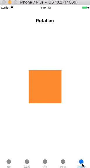 旋转手势识别器(UIRotationGestureRecognizer)与捏合手势类似,都需要两个手指,通过修改rotation来改变视图的变换。通常,旋转手势与其他手势组合使用。