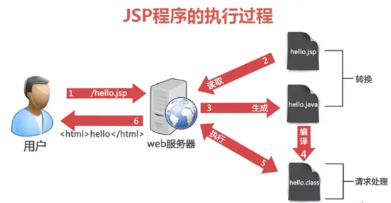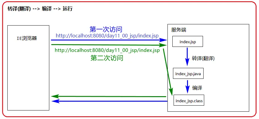 - 当jsp页面第一次被访问时,服务器会把jsp编译成java文件(这个java其实是一个Servlet类);