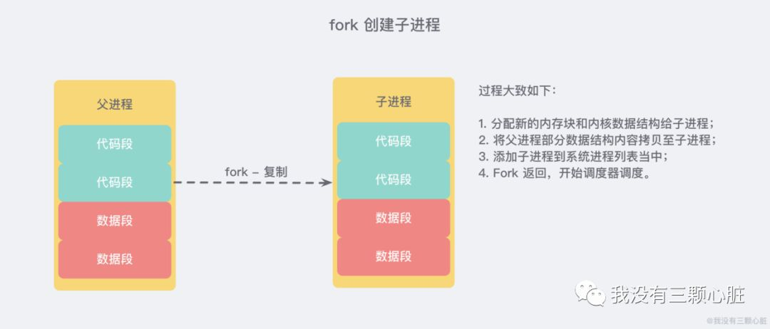 操作系统多进程 COW(Copy On Write) 机制 拯救了我们。Redis 在持久化时会调用 glibc 的函数 fork 产生一个子进程,简单理解也就是基于当前进程 复制 了一个进程,主进程和子进程会共享内存里面的代码块和数据段: