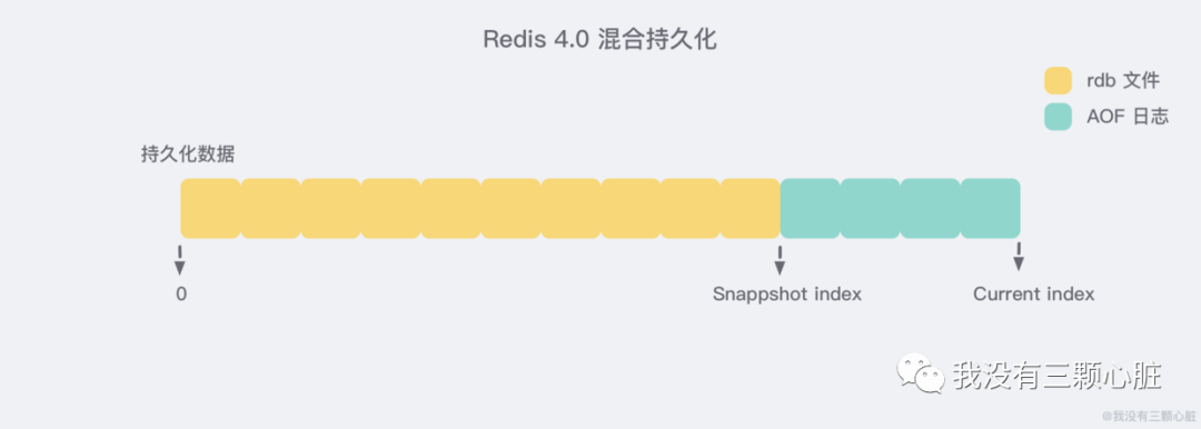Redis 4.0 为了解决这个问题,带来了一个新的持久化选项——混合持久化。将 rdb 文件的内容和增量的 AOF 日志文件存在一起。这里的 AOF 日志不再是全量的日志,而是 自持久化开始到持久化结束 的这段时间发生的增量 AOF 日志,通常这部分 AOF 日志很小: