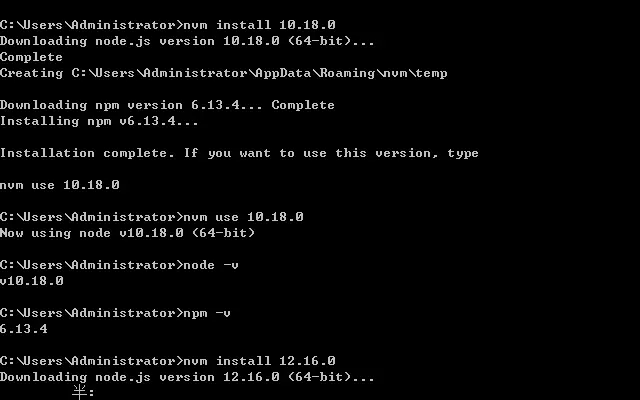 - 安装node.js, 打开nodejs官网查看node历史版本,找到自己需要的版本号,执行nvm install 版本号(例如nvm install 10.18.0)即开始下载nodejs,如下图成功安装nodejs和npm