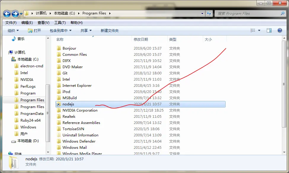 - 设置nodejs prefix(全局)和cache(缓存)路径, 使用nvm安装nodejs成功后会自动创建一个nodejs的快捷文件夹,文件路径是在安装nvm时控制的, 默认是C:\Program Files\nodejs