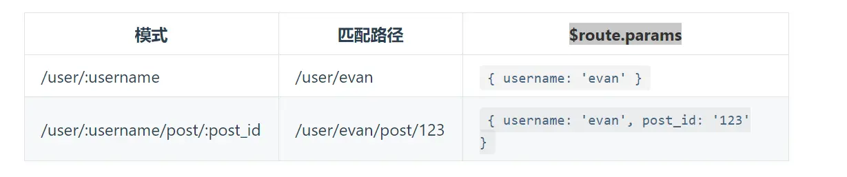 :标记。当匹配到一个路由时,参数值会被设置到this.$route.params,可以在每个组件内使用。 - 比如模式是