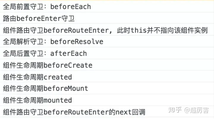 - 要注意的是该守卫内访问不到组件的实例,也就是this为undefined,也就是他在beforeCreate生命周期前触发。