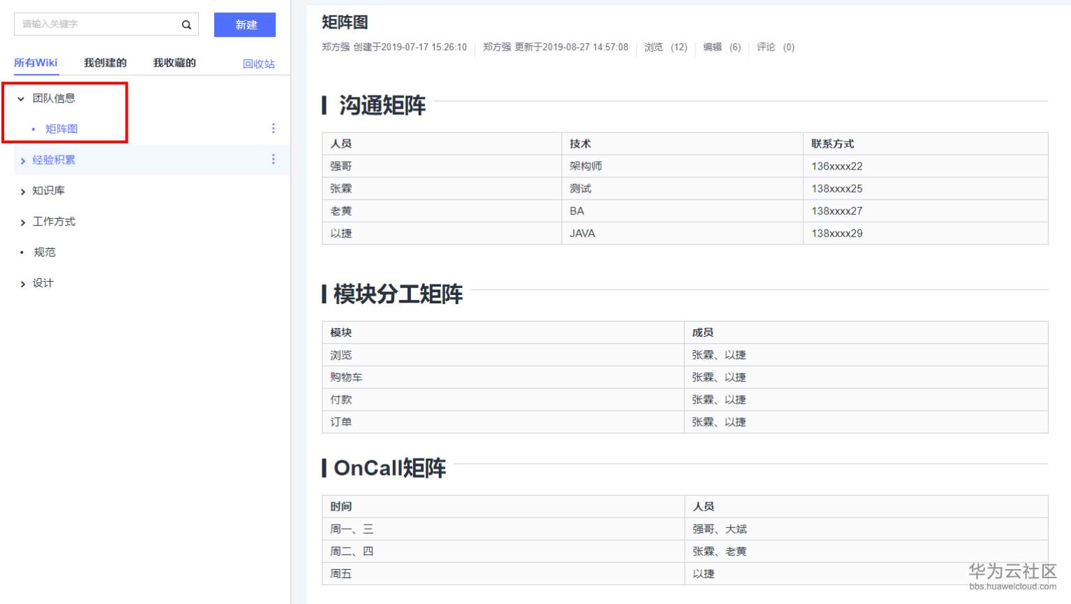 用来记录项目团队的职能划分,职责担当等。当新人入职时,可以通过在Wiki中的团队信息,了解团队的组织分工等。这样一方面可以让新员工对团队人员分工有所了解方便日后的交流,另一方面也能让具备较高能力的新员工根据团队组织分工现状提出改善意见等。