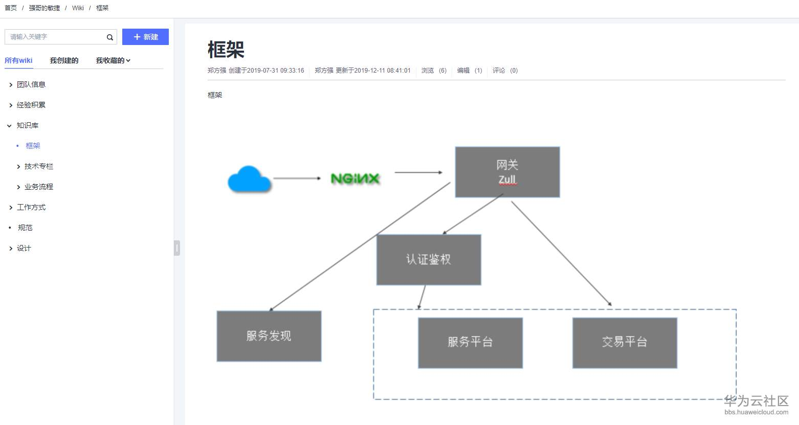 DevCloud是集华为研发实践、前沿研发理念、先进研发工具为一体的研发云平台(更多了解请见附件或官网),也是笔者目前在使用的。以DevCloud为例,在DevCloud中提供了Wiki服务。Wiki本身是一种以知识库文档为中心,共同创作为手段,依靠众人不断地更新修改为实现的多人协作的工具。我们可以通过Wiki来管理和搭建项目或团队内的信息管理库,以达到有知识点可留存,有基本信息可查的目的,参考如下:
