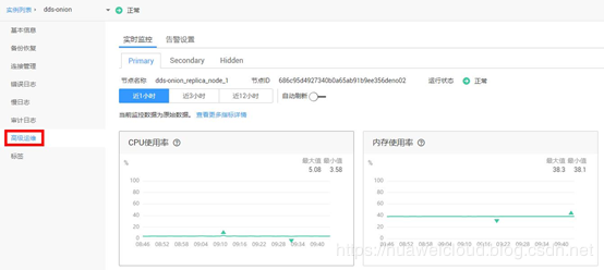 1.在实例基本信息页,新增高级运维菜单。该菜单上面有两个页签“实时监控”和“告警设置”,这里面的内容是Console直接调CES接口获取的指标,用户交互和CES界面上一致,在高级运维的界面,展示了文档数据库实例最关键的指标,例如CPU使用率、内存使用率、磁盘使用率等,更多指标有便捷的超链接到CES界面上查询。