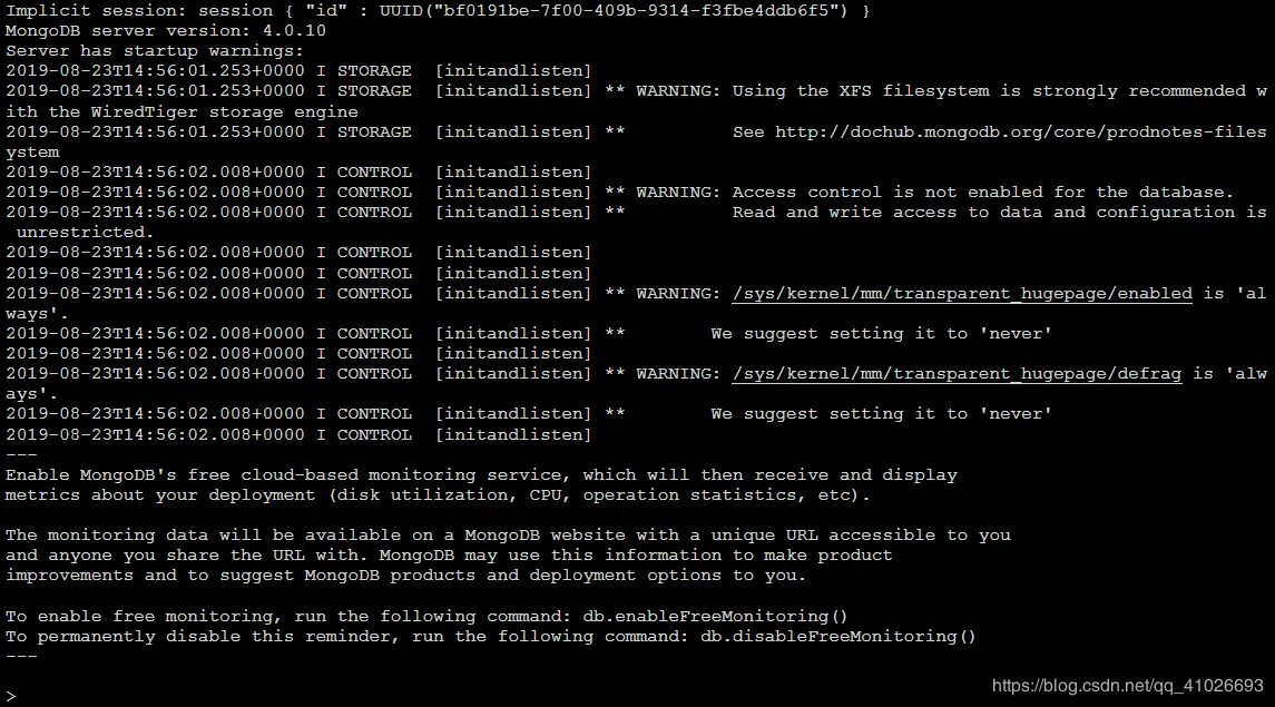 docker exec -it fb1517df4885 mongo admin这命令是以admin角色连接mongo。输完命令出现下面的页面: