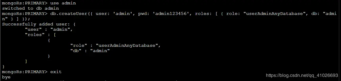 db.createUser({ user: 'admin', pwd: 'admin123456', roles: [ { role: "root", db: "admin" } ] });