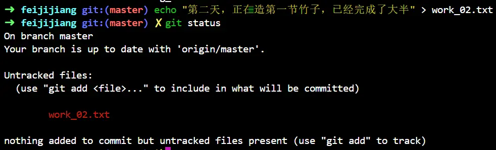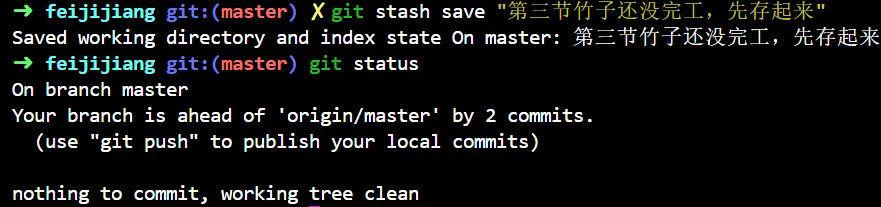 这是飞机酱的工作记录,前两节竹子都完工了,所以各自有各自的commit,第三节现在还在工作区,我们要使用 stash 把这份工作保存起来: