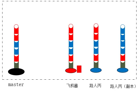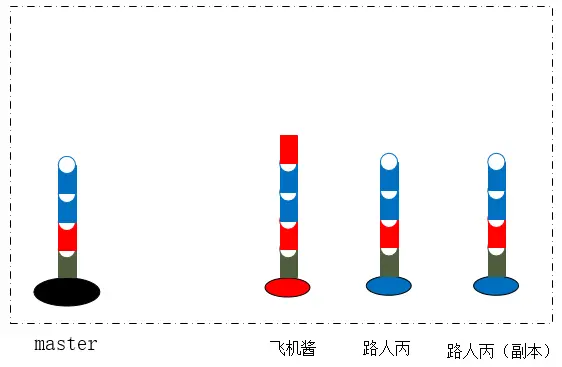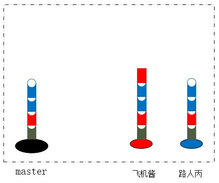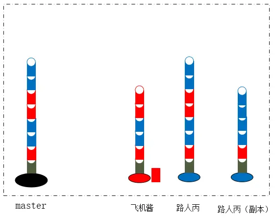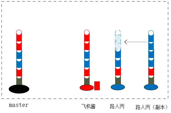 此时,让我们分析一下,为什么没有了冲突,而且先pull再merge,还是会有一个合并的记录?靠想比较麻烦,我们看看模型就知道了,路人丙把飞机酱的竹节安在了自己的竹子上,又在副本新造了两节竹子: