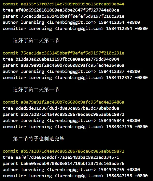 第一天走的比较早,到家后飞机酱听说老板过去视察工作了,内心有点慌乱,于是第二天早早去上班,看了一下竹子,完美的三节,不禁感叹路人丙干活能力确实不赖。今天来的早,要赶紧追一追,于是马上进入工作状态。先是用git pull把昨天路人丙的工作同步过来,才开始接着造竹节。在路人丙来之前,第一节已经造了大半了。此时他的工作记录如下: