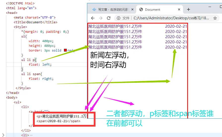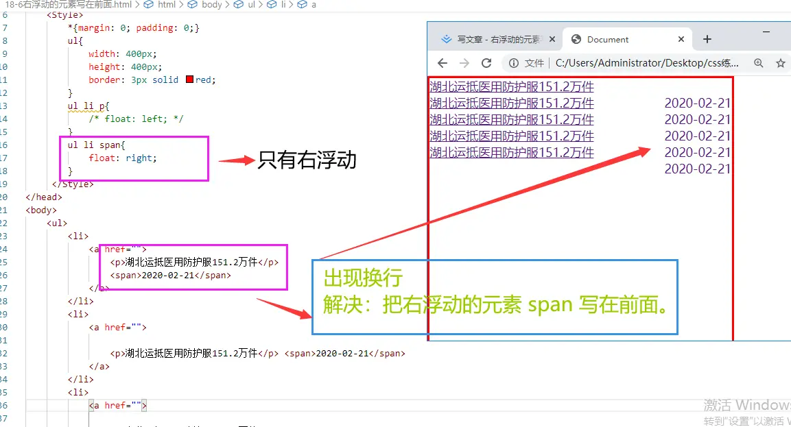 右浮动的元素写在前面 姜雅君 2020-03-21 231 阅读1分钟 右浮动的元素写在前面:1.如果盒子中只有右浮动,没有左浮动,效果会有错行的效果。 解决:把右浮动的元素写在前面2.如果一个盒子中只有右浮动,没有左浮动,通常把右浮动的元素写在前面。3.如果有左浮动,也有右浮动,那么谁写在前面(左浮动的元素或是右浮动的元素)都OK的。