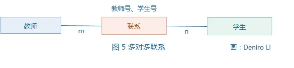 若对于实体集 A 中的每一个实体,实体集 B 中有 n 个实体(n≥0)与之联系,反过来,对实体集 B 中每一个实体,实体集 A 中也有 m 个实体(m≥0)与之联系,则称实体集 A 与实体集 B 具有多对多联系,记为 m:n。教师与学生这两个实体类间的教与学的联系就是多对多的联系。这时,只有<教师、学生>对才能确定一个特定的教学联系。