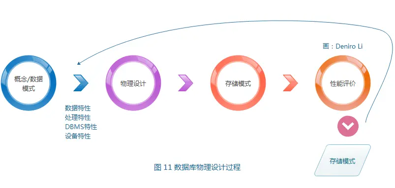 数据库在实际的物理设备上的存储结构和存取方法称为数据库的物理结构。数据库物理设计是利用已确定的逻辑结构及 DBMS 提供的方法、技术,以较优的存储结构、数据存取路径、合理的数据存储位置及存储分配,设计出一个高效的、可实现的物理数据库结构。显然,数据库的物理设计是完全依赖于给定的硬件环境和数据库产品的。数据库物理设计过程如图 11 所示。